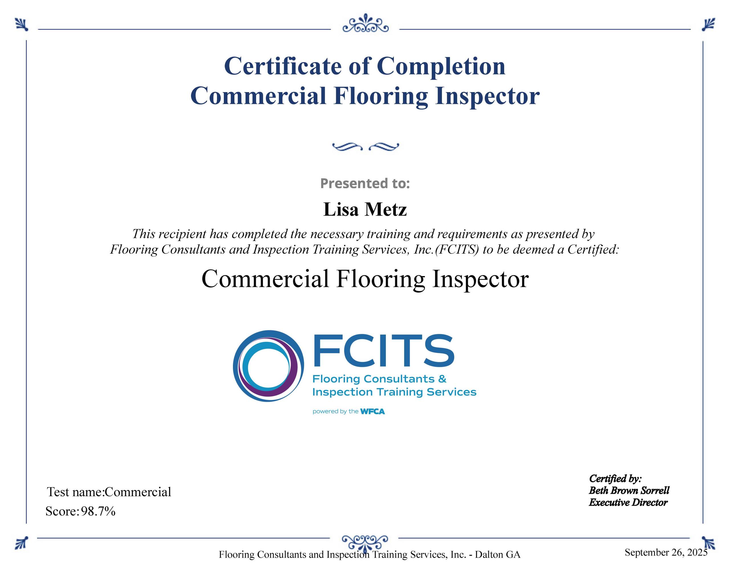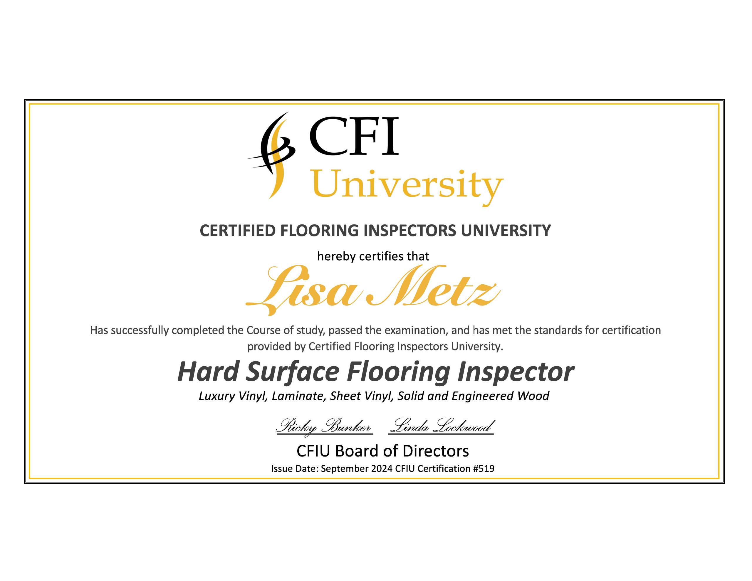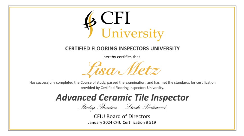 Metz entered the flooring industry in 2019, with a background that includes manufacturing support, business law, and education. She first obtained her inspection certifications from FCITS in 2022, and added the CFIU certification in summer 2024. She supplements her training by attending industry events in Dalton, GA and across the country, to stay abreast of new product innovations and developing trends. Originally from New York, she currently resides in Charlotte, NC, and her territories include North & South Carolina, New York, and Minnesota.